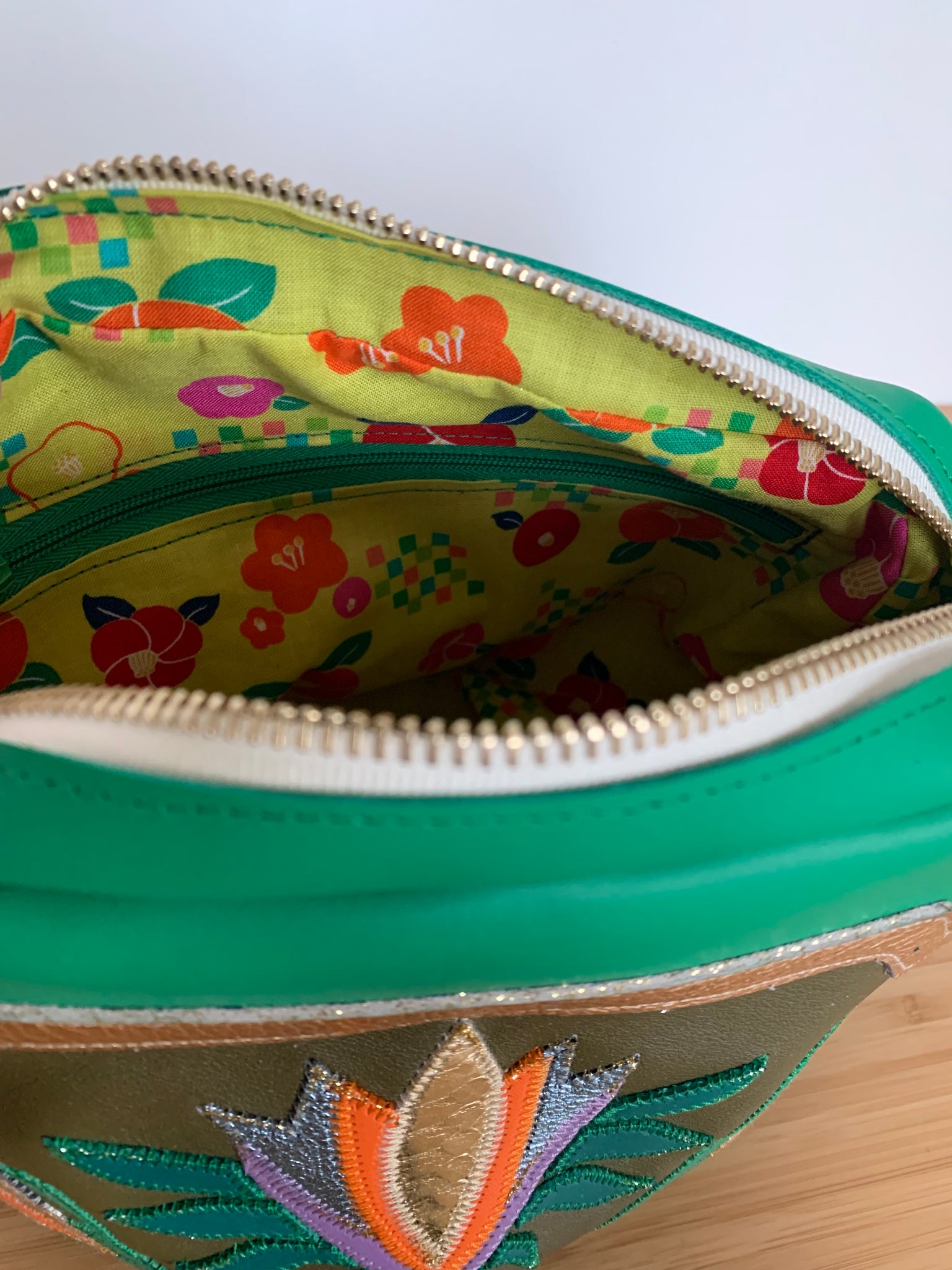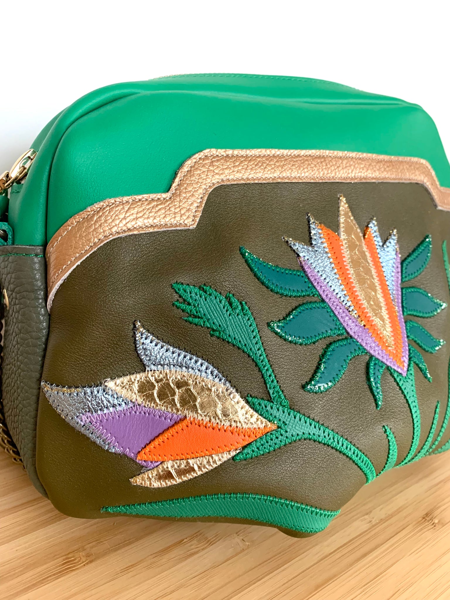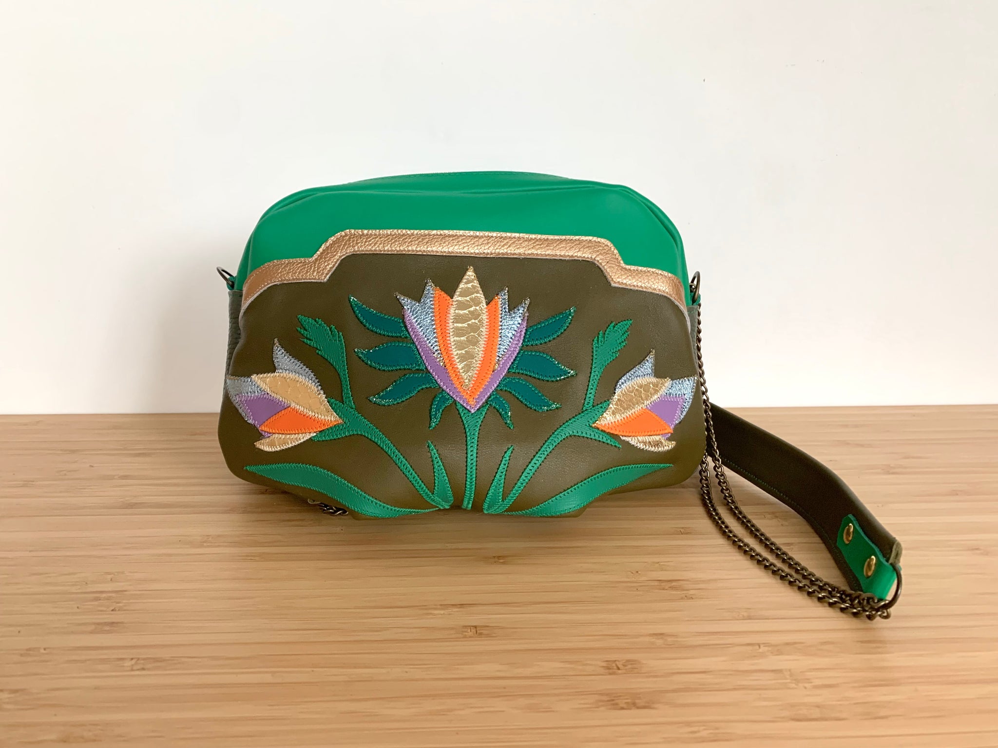 Cette besace est un petit bijou floral , il est réalisé en cuir de veau .