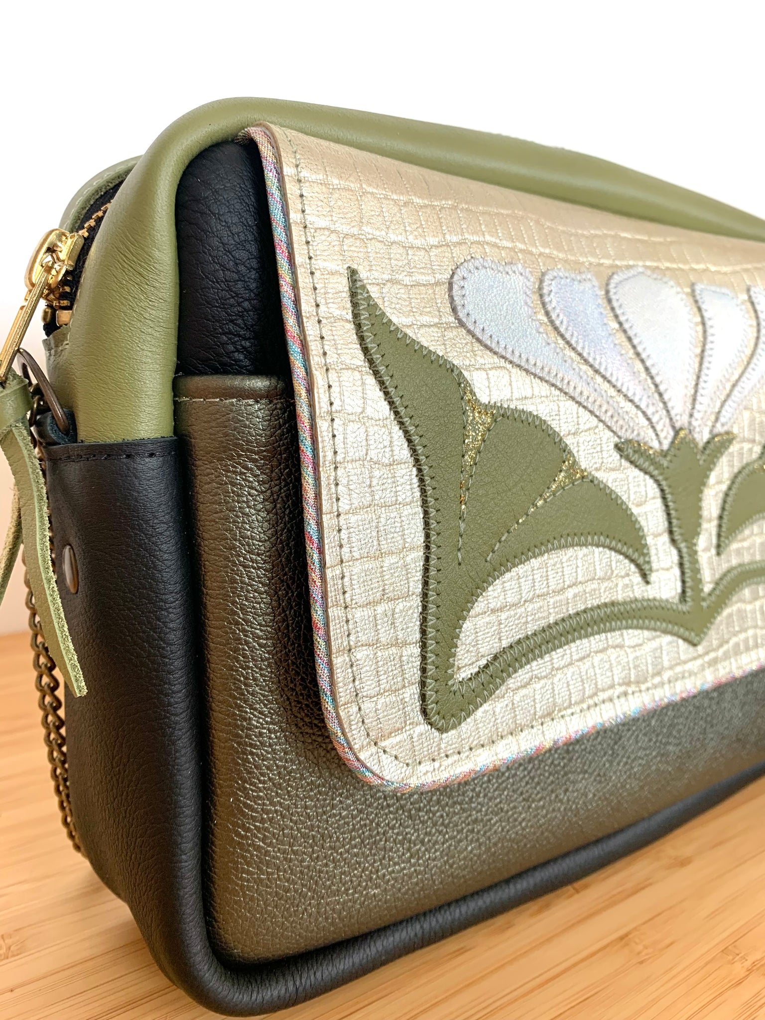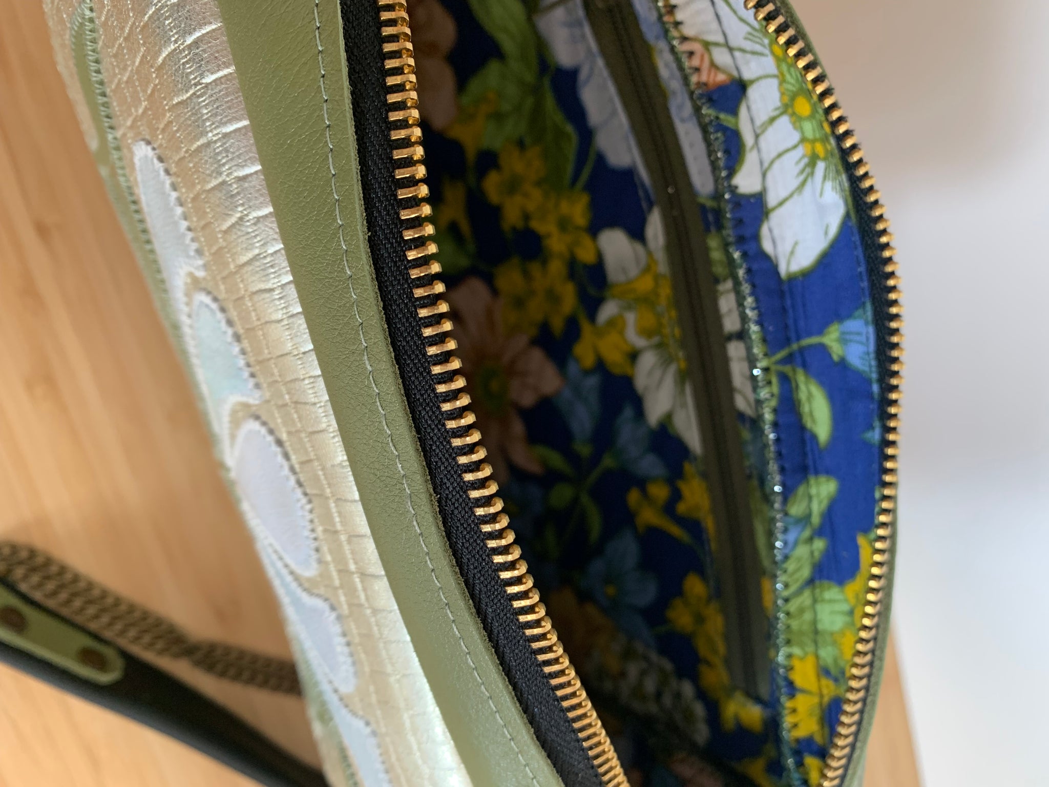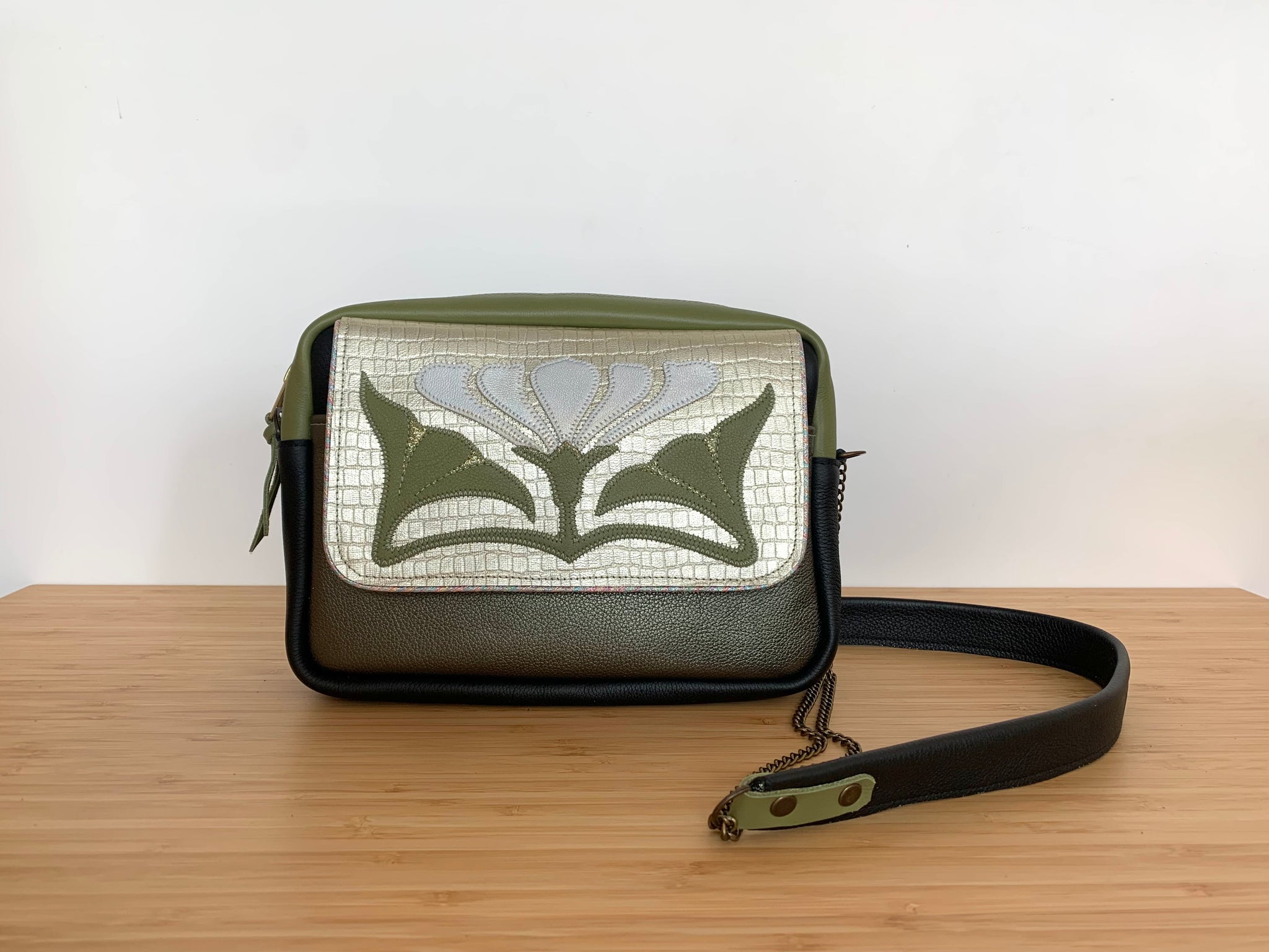 Cette besace est unique , réalisée à partir de veau embossé croco et de cuir de veau.