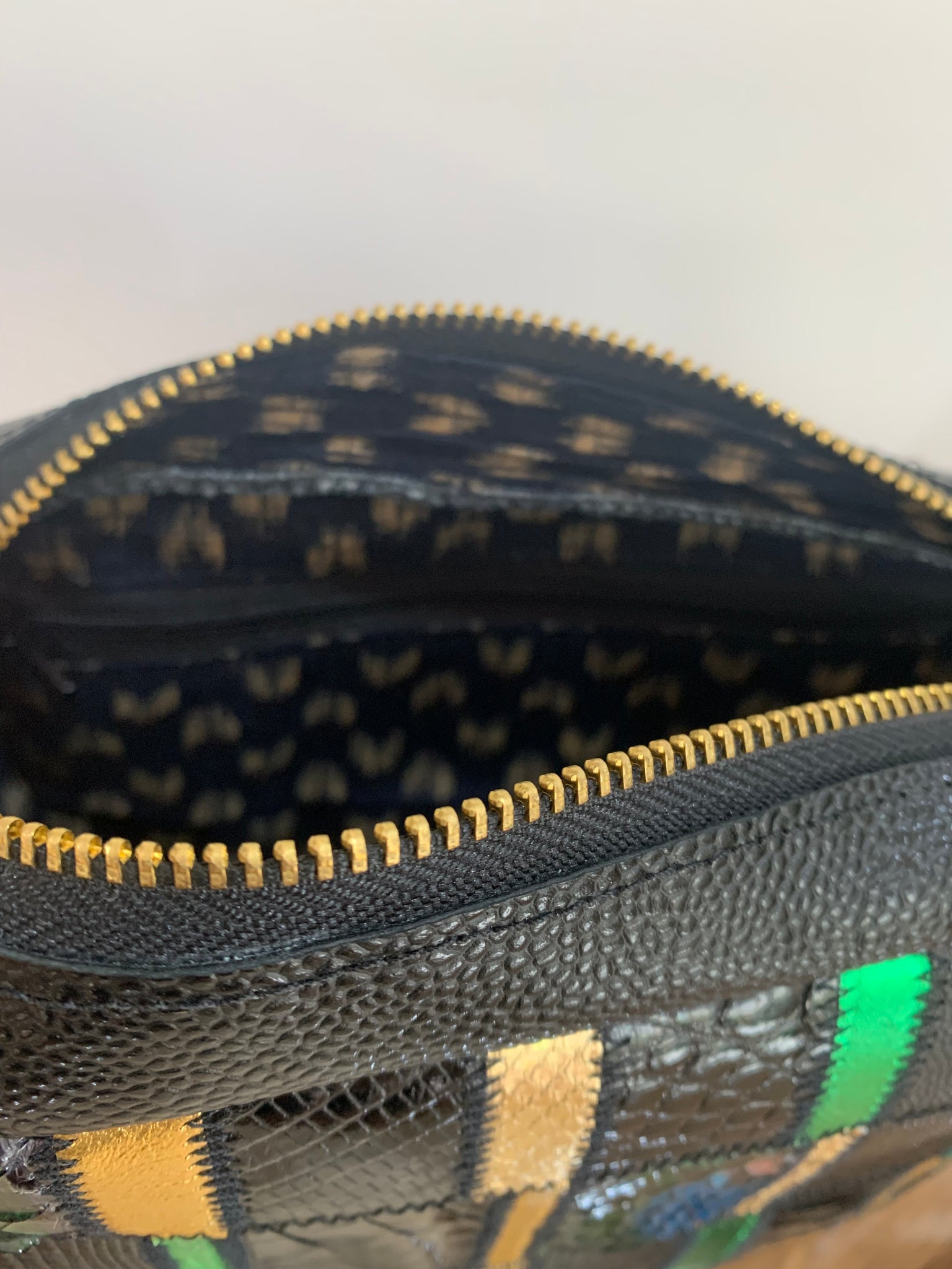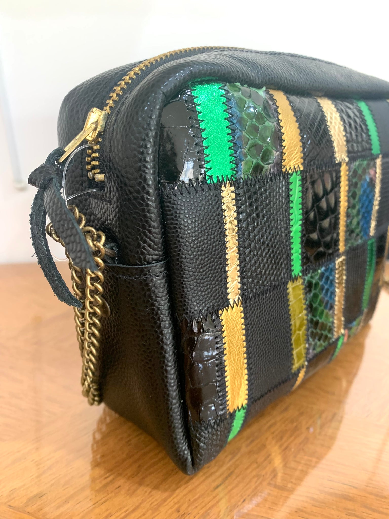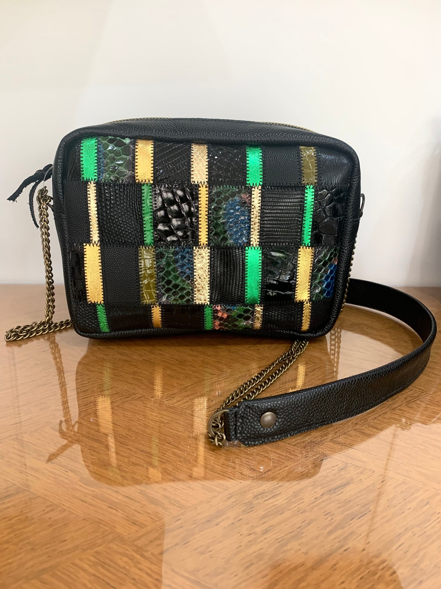 Sacoche graphique en patchwork de cuirs : croco, python , veau, agneau