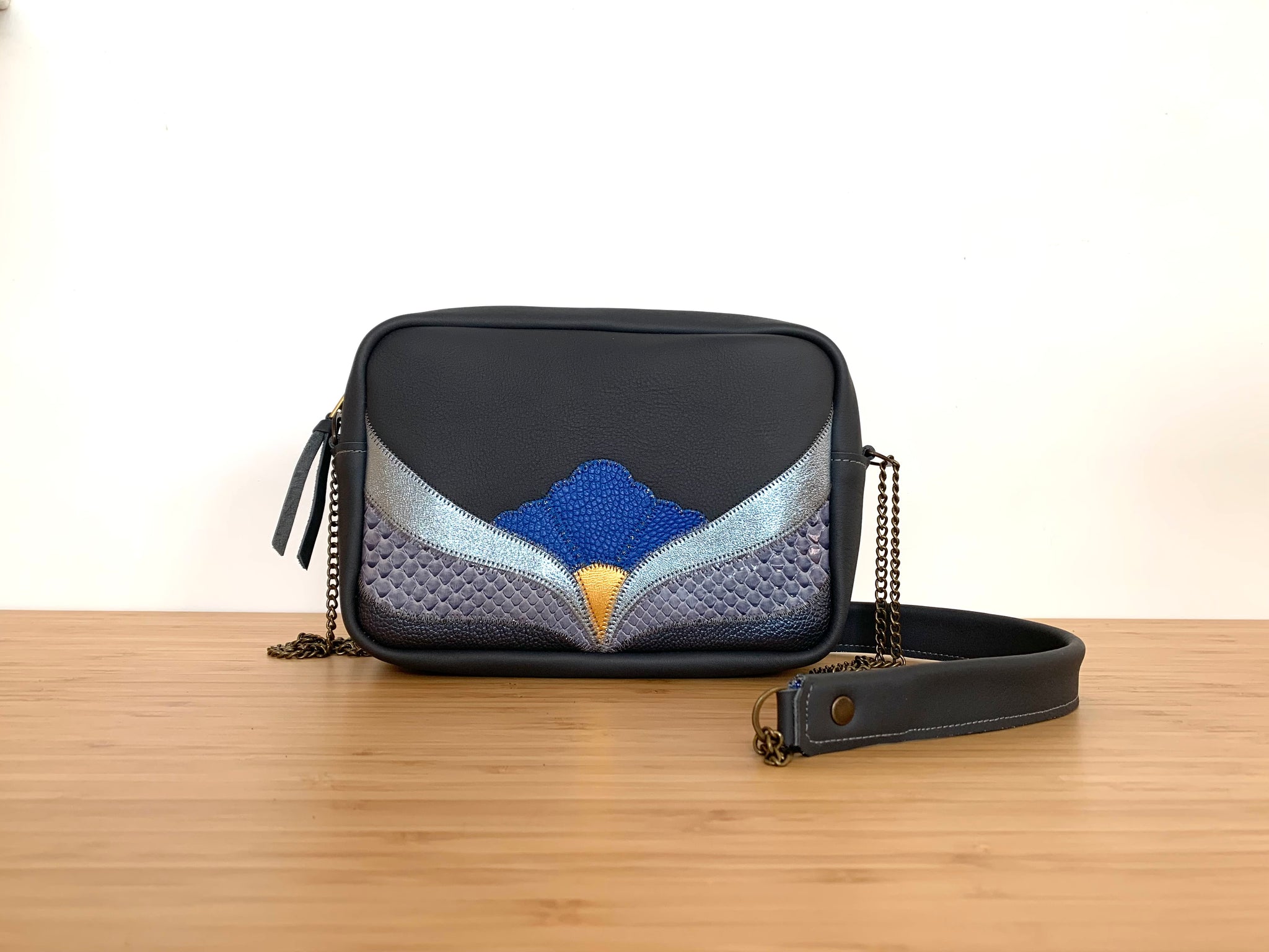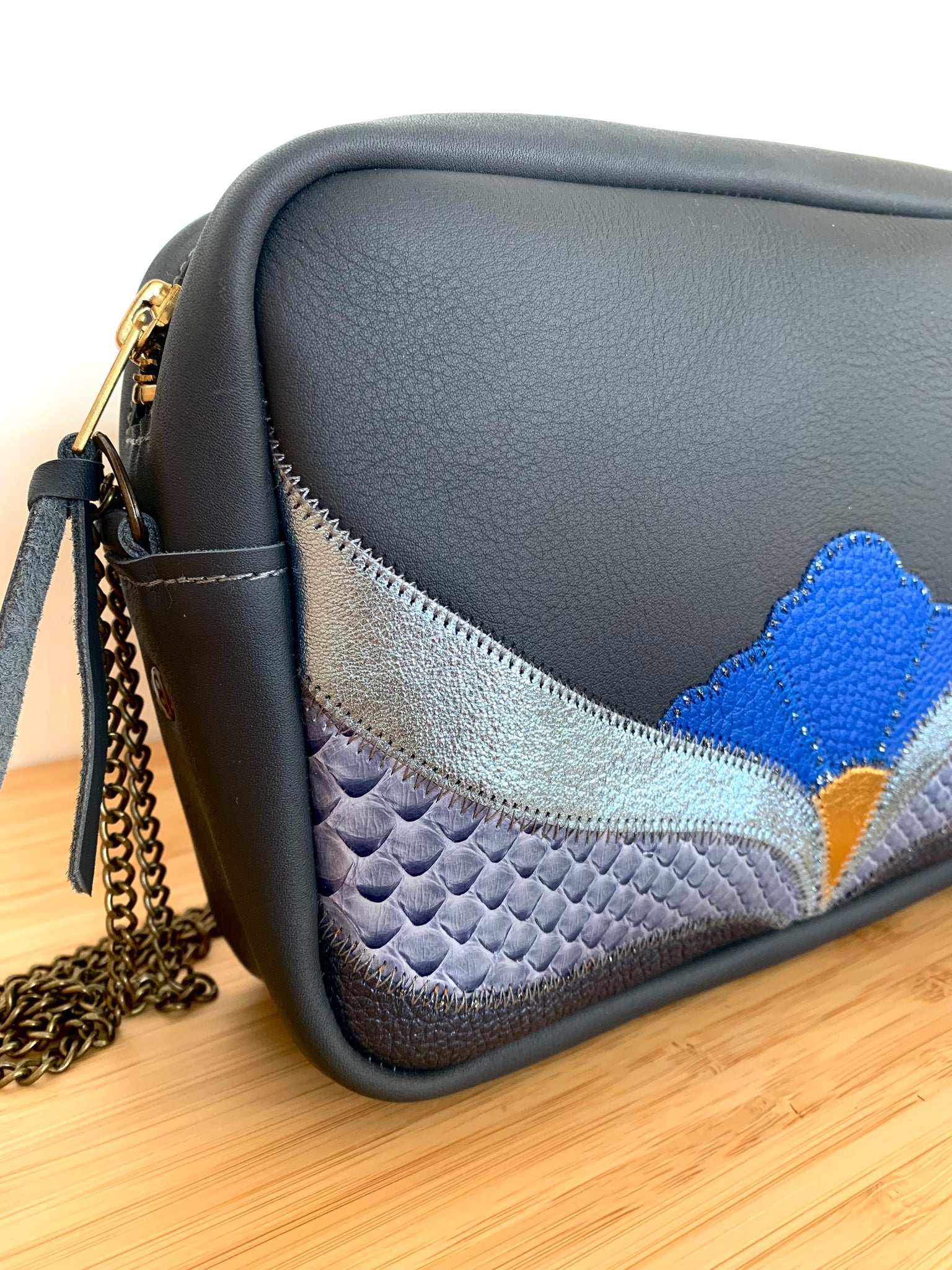 Sacoche florale en cuir de veau , python et chèvre métallisée