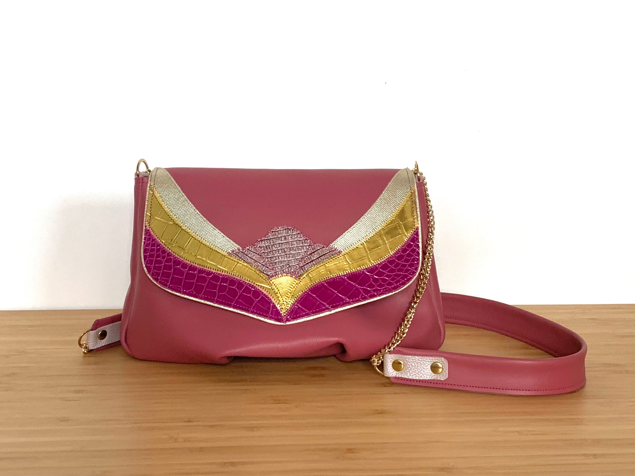 Besace florale en cuir de veau , lezard et croco
