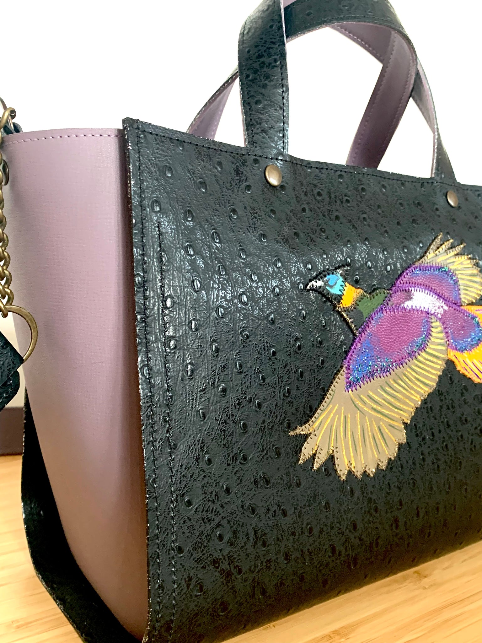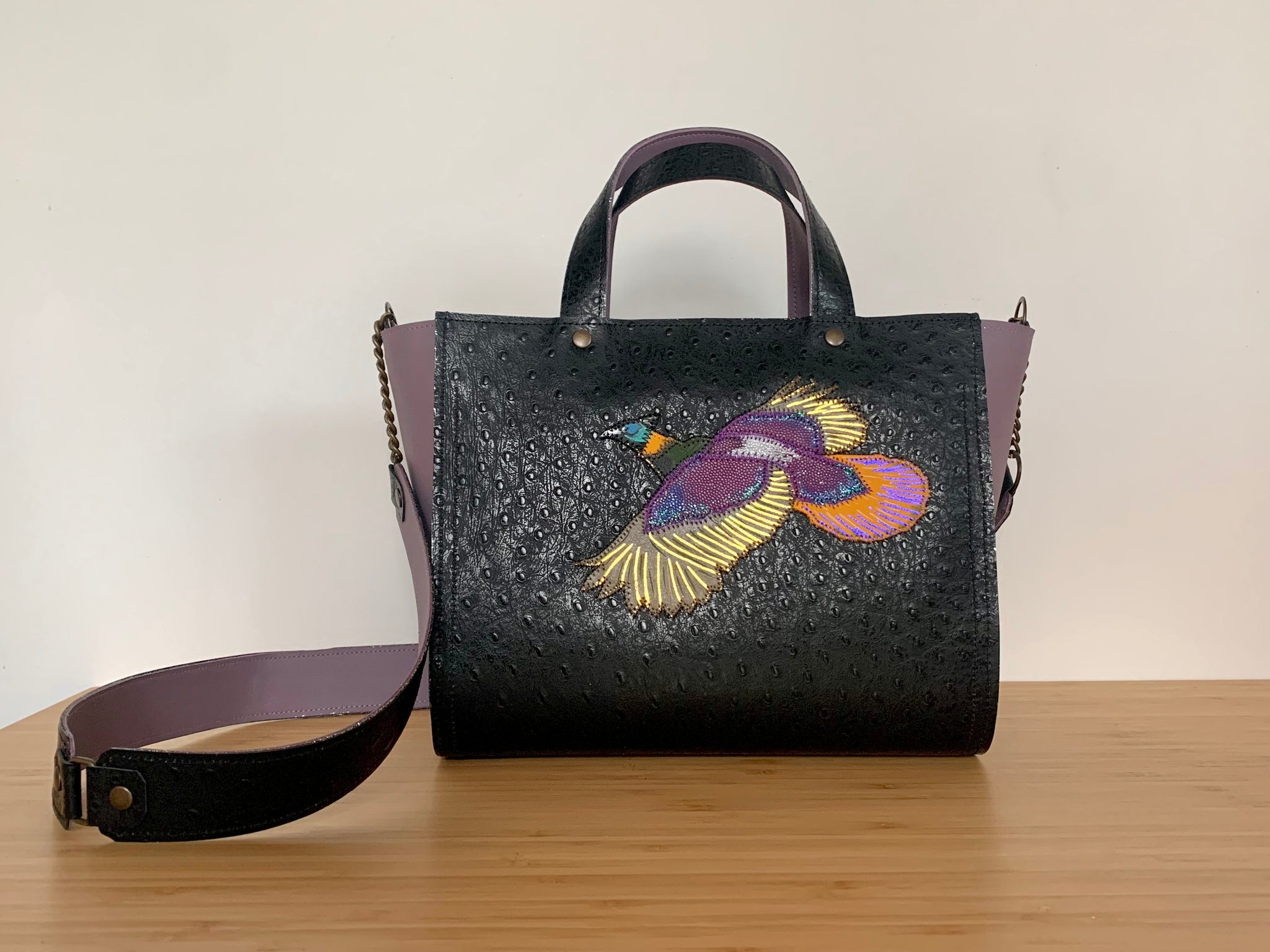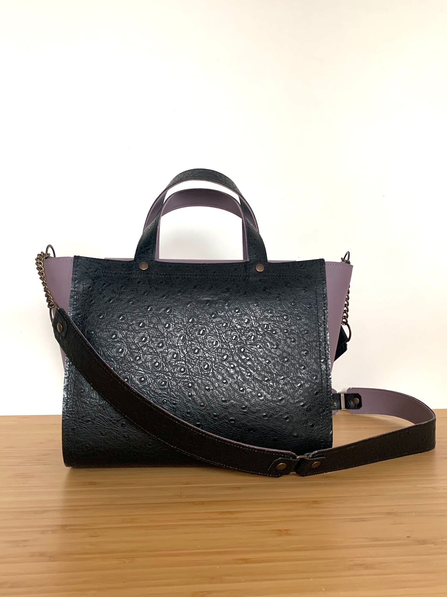 Ce sac est une pièce entièrement construite à partir du cuir de veau imprimé façon peau d’autruche provenant de stock inutilisé de maison de luxe . Son format est parfait pour celles qui ne savent pas alléger le contenu du sac : 32 cm à l’ouverture du sac pour une base à 25 cm ; 20 cm de hauteur et 14 cm de largeur de profondeur .