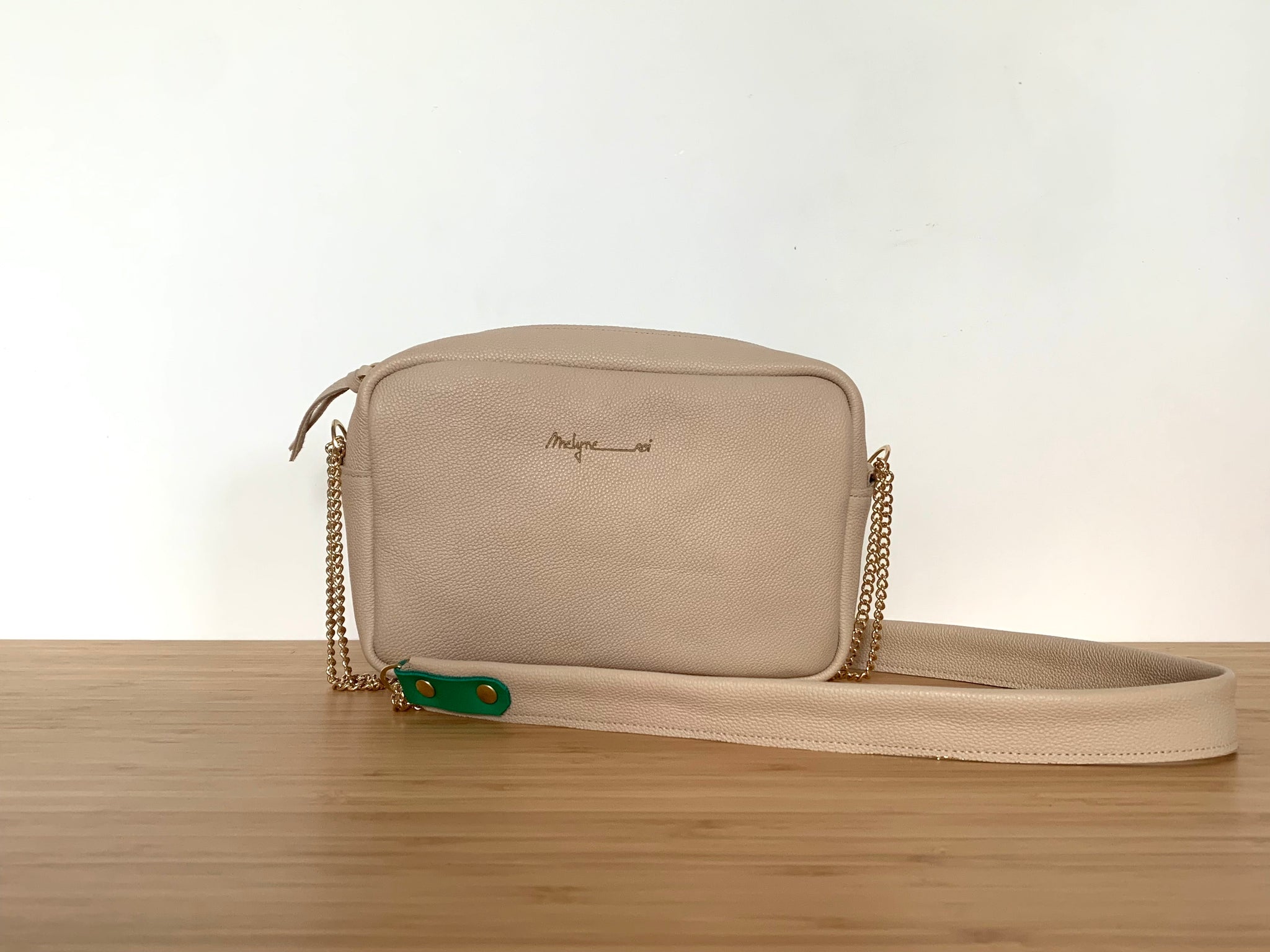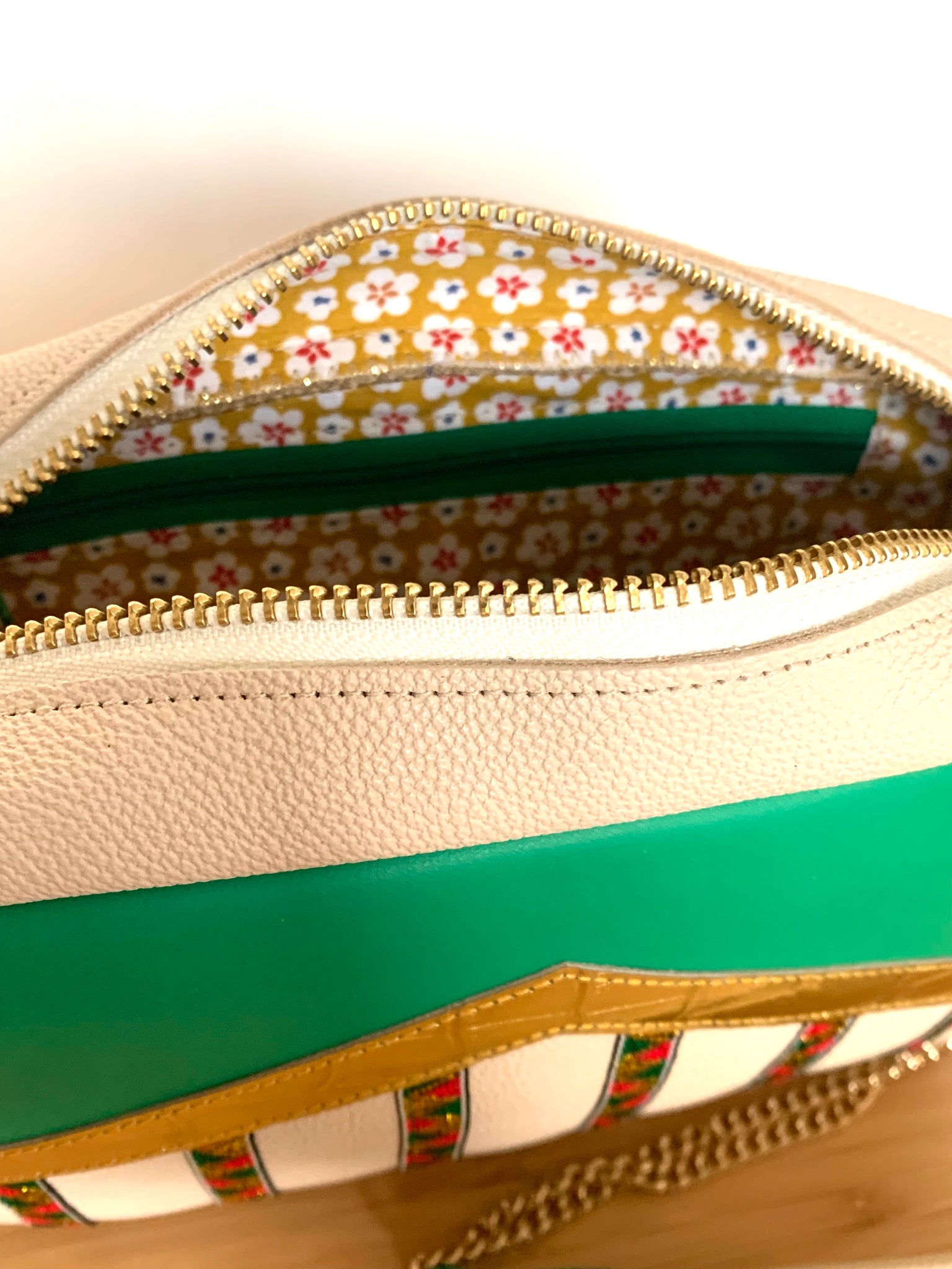 Il est réalisé en cuir de veau et serpent d’eau , rehaussé d’un galon provenant de Thaïlande