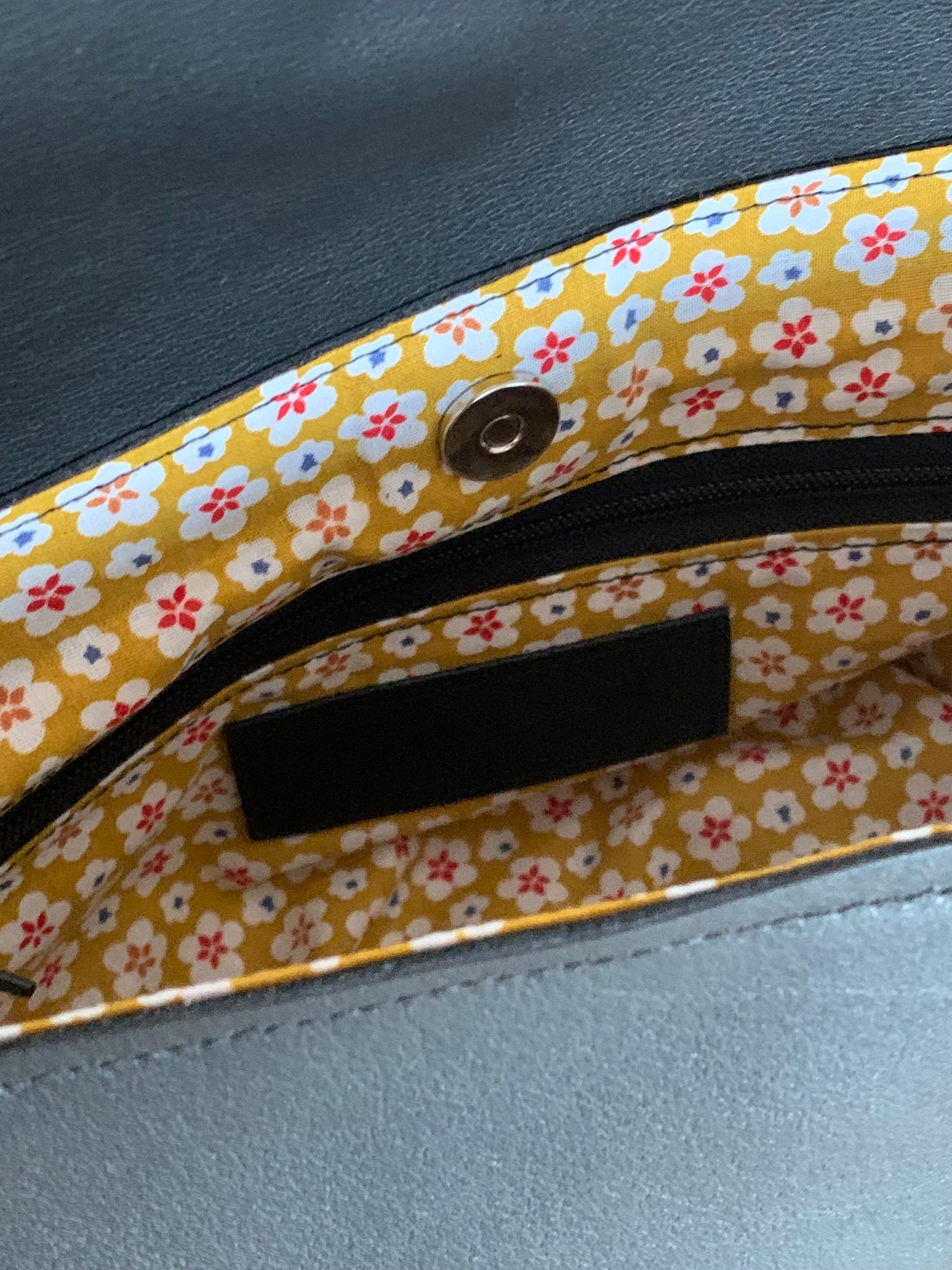 Il possède une petite poche zippée intérieure et de ferme grâce à deux aimants .