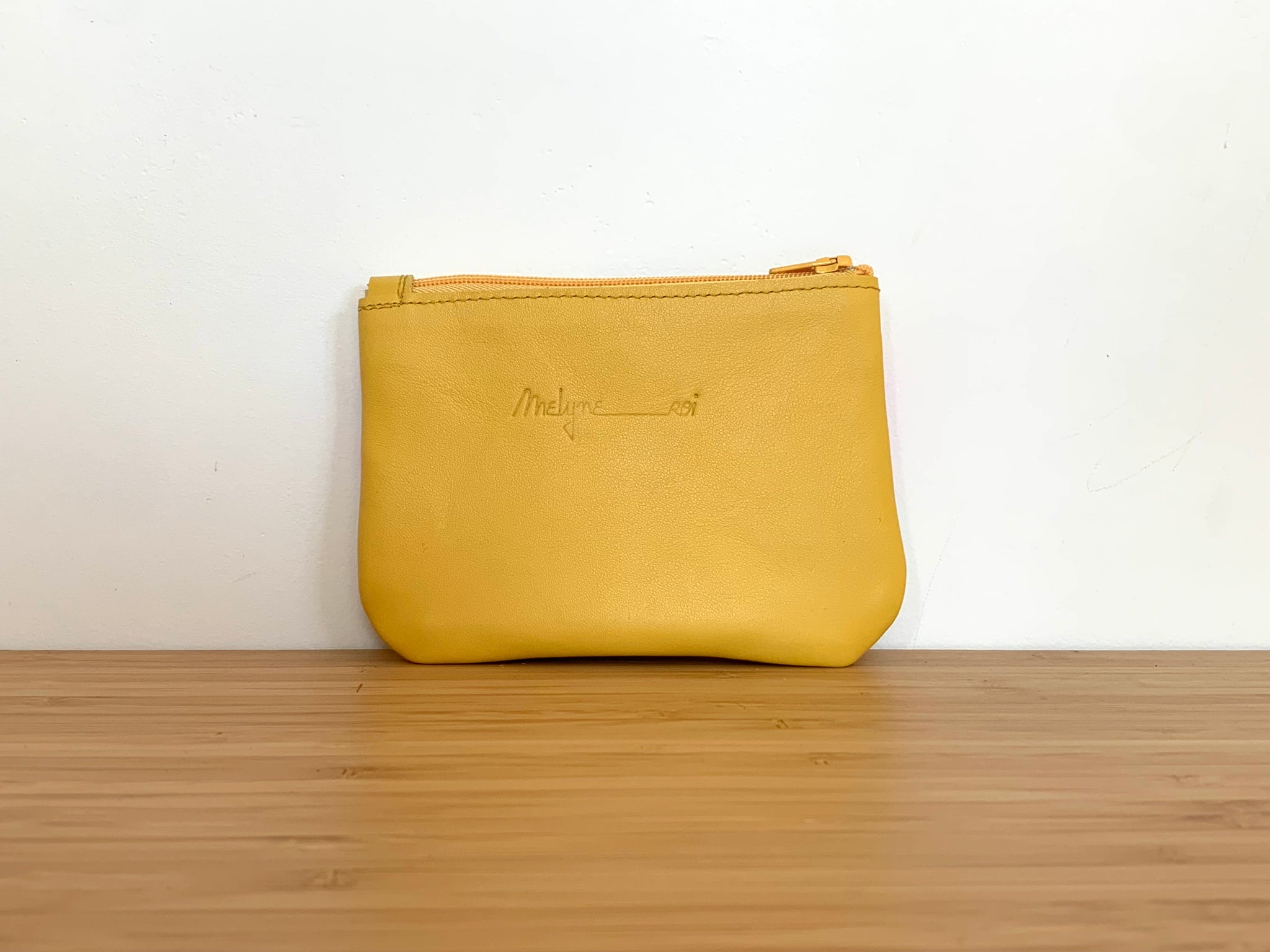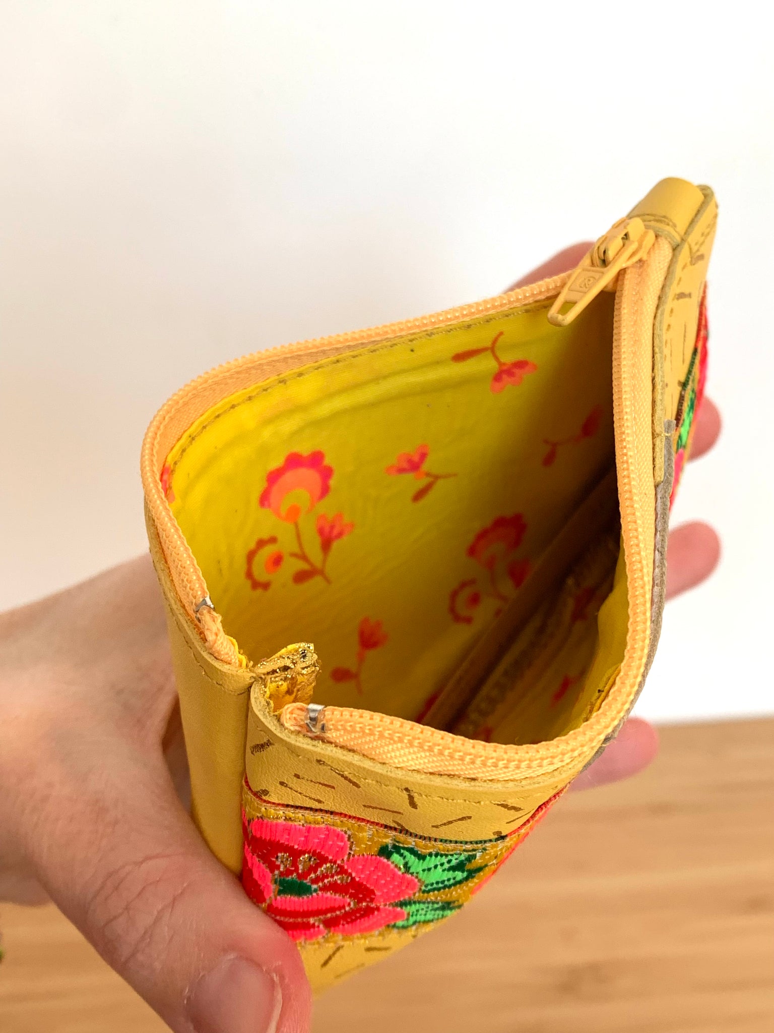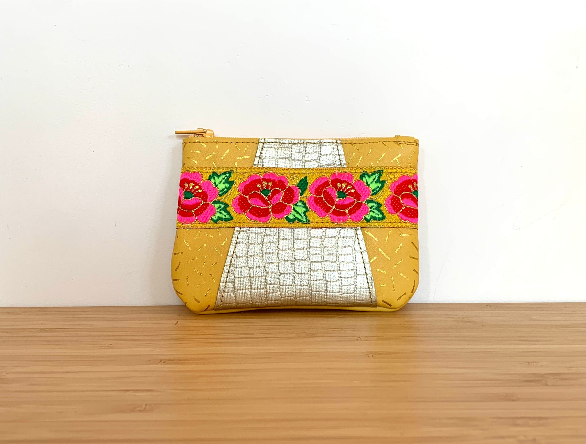 Joli porte-monnaie en cuir de veau rehaussé d’un galon thaïlandais et de cuir d’agneau embossé